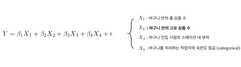 Y를 정의했으니 이제 X들을 찾아야겠죠. 바구니 처리 속도와 상관관계가 있는 수많은 변수들 중 해석을 저해할 만한(ex- 다공선성, 내생성..) 것들을 제외하고 아래와 같이 회귀분석을 수행한 결과, 가장 영향력 있는 변수는 ‘바구니 안의 고유한 상품 수’라는 사실을 알 수 있었습니다.