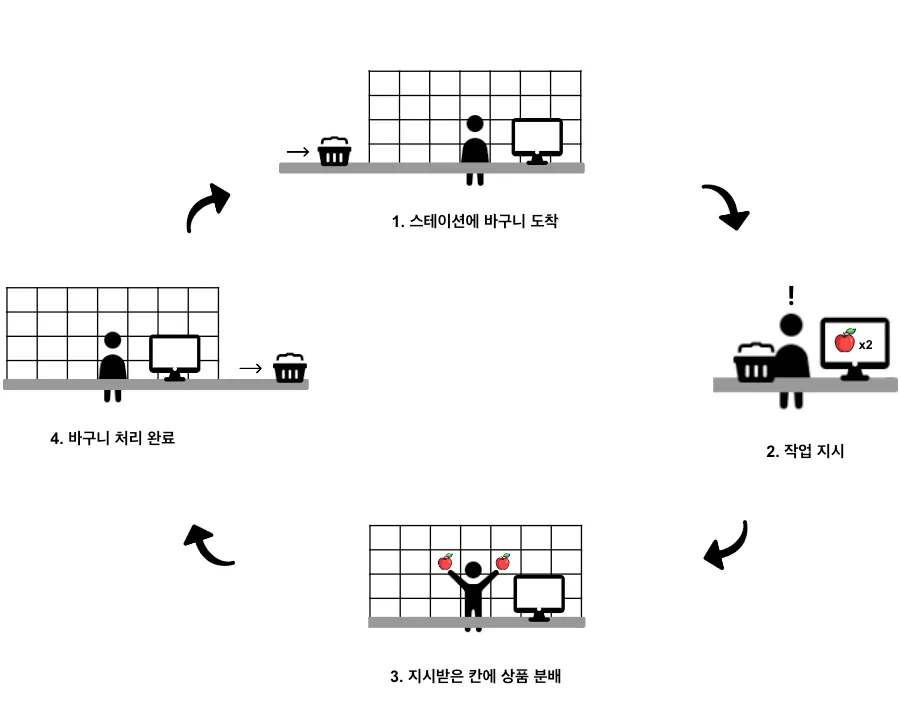 QPS에서는 위 그림과 같은 순서로 작업이 이루어집니다. 먼저 작업자가 위치한 작업대(스테이션, station)로 바구니가 도착합니다. 작업대 입구에 설치된 스캐너가 바구니를 인식하고, 처리해야 할 상품들을 차례대로 모니터에 보여줍니다. 작업자가 상품을 하나씩 스캔하면 상품을 넣을 칸 번호가 모니터에 출력됩니다. 작업자는 칸 번호를 확인하고 뒤에 위치한 칸에 상품을 넣습니다(각 칸은 주문 하나를 의미합니다). 상품 분배가 완료된 칸(주문)은 선반 뒤 작업자가 포장 공간으로 이동시킵니다.
