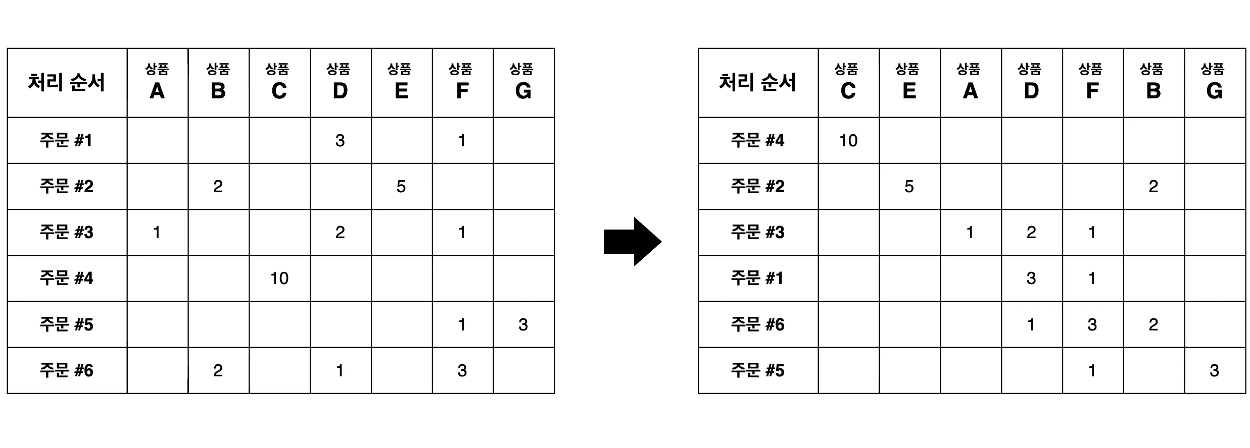 먼저 주문-상품 행렬을 만들고, 오른쪽과 같은 대각(에 가까운) 행렬을 지향하면서 행과 열을 특정 횟수만큼 섞어줍니다. 그 과정이 완료된 다음 인접한 주문들끼리 묶어주면 고유한 상품 수를 최소화하는 주문의 조합을 구할 수 있게 됩니다. 만약 주문을 정렬하지 않고 왼쪽과 같이 3번과 4번 주문을 묶는다고 가정하면 이 주문 조합의 고유한 상품 수는 4개지만, 오른쪽과 같이 정렬된 상태에서 인접한 3번과 1번을 묶어준다면 고유한 상품 수가 3개로 적어집니다. 대각화가 어느 정도 잘 진행된다면 충분히 합리적인 결과를 보여줄 수 있는 알고리즘인 것이죠.