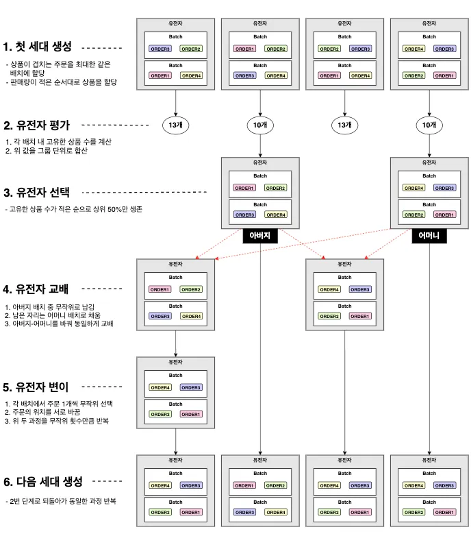 우선 같은 batch 안에 서로 유사한 주문들이 담기도록 최대한 신경 쓰면서 첫 세대를 생성합니다. 그다음 각 유전자 내 고유한 상품 수를 계산하고, 이 값이 작은 순으로 상위 50%만 생존시킵니다. 저희가 원하는 것은 바구니 안의 고유한 상품 수를 최소화하도록 할당할 수 있는 주문 조합(=유전자) 이기 때문에 그 목적에 맞는 적합도를 계산해서 평가하는 것이죠. 이제 batch 단위로 특정 조건에 따른 교배 및 변이를 수행함으로써 자식 세대를 생성하고, 이 과정을 특정 횟수만큼 반복하면서 최적의 주문 조합을 탐색해나갑니다.