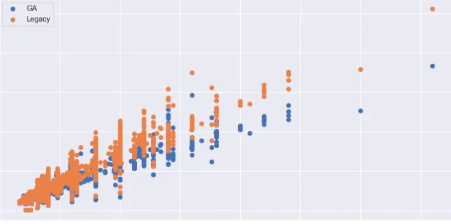 실제 과거의 주문 데이터를 가지고 기존 알고리즘(대각 행렬 알고리즘, Legacy)과 유전 알고리즘(GA)을 각각 적용하여 나온 결과는 다음과 같습니다.
