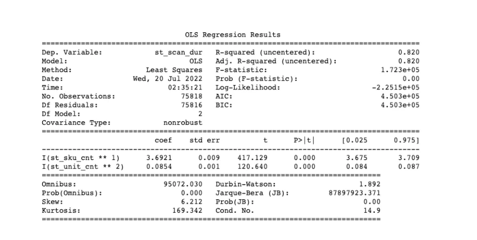약 7만 5천 건의 실제 데이터로 연산한 결과 특히 R-squared가 0.8이상으로, 와 를 잘 통제한 상태에서 바구니 내 상품 구성을 알 수 있다면 처리 속도를 꽤나 성공적으로 계산해낼 수 있는 것처럼 보입니다.
