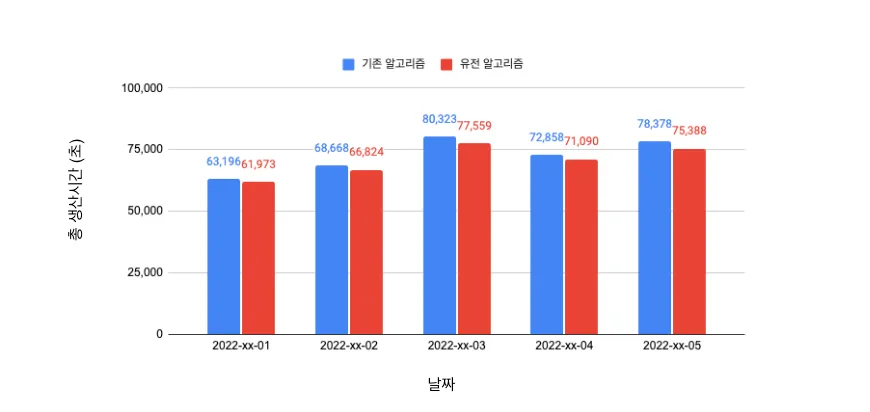 1부에서는 유전 알고리즘과 기존 알고리즘 간 ‘주문 그룹 내 상품 가짓수’만 비교해 볼 수 있었습니다. 하지만 이제는 Digital Twin에서 마음껏 실험하면서 다양한 지표를 계산할 수 있습니다. 저희는 그중에서 특히 ‘동일한 주문 그룹에 대한 총 처리 시간’이 얼마나 차이날 지가 가장 궁금했습니다.