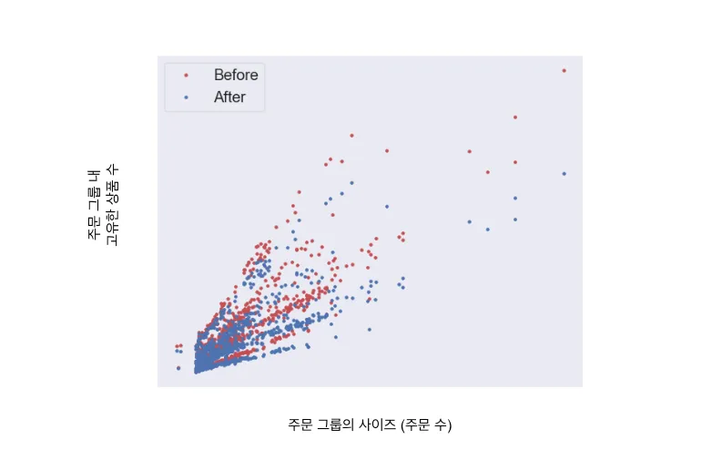 위 그래프의 빨간 점과 파란 점은 각각 유전 알고리즘이 적용되기 전과 후의 주문 그룹 내 상품 가짓수를 나타냅니다. 보시다시피 사이즈가 동일한 주문 그룹에 대해서, 기존 알고리즘 대비 상품 가짓수가 거의 일관되게 낮습니다. 센터 작업자 분들께 피드백을 받아본 결과 실제 현장에서도 체감될 정도의 변화라고 하시니, 다른 센터에 적용했을 때의 결과도 기대됩니다.