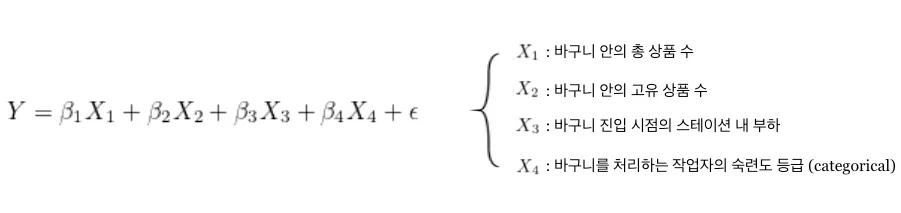 우선 바구니 안에 해당 작업자가 처리해야 하는 상품이 총 몇 개고(), 몇 가지 종류가 들어있는지()에 따라 분배 속도가 달라질 것은 명백합니다. 또한 처리 당시가 얼마나 바쁜 상황이었는지도 속도에 영향을 줄 수 있습니다. 실제로 주문이 많이 몰려 전반적인 작업량()이 증가할수록 바구니를 빨리빨리 처리하는 경향이 짙습니다. 마지막으로 숙련된 작업자일수록(****) 작업 과정을 잘 이해하고 있기 때문에 처리 속도가 빠를 것입니다.
