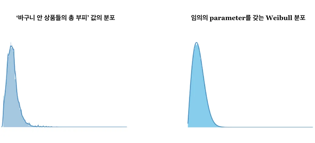 오른쪽 그래프는 임의의 parameter를 갖는 Weibull 분포이며, 모양만 봤을 때 왼쪽과 꽤나 유사해 보입니다. 그렇다면 들의 모집단(=의 집합)은 ‘Weibull 분포를 따르는 것이 아닐까?‘라는 합리적인 의심을 해볼 수 있겠습니다. 이와 같이 모집단의 분포에 대한 의심이 가능한 상황에서는 MLE(Maximum Likelihood Estimation)를 활용할 수 있습니다. 쉽게 말하면 어떤 샘플이 나왔을 가능성(likelihood)이 가장 큰 분포를 찾는 것이며, 일반적으로 이런 상황에서 쓸 수 있는 가장 우월하고 기초적인 방법입니다.