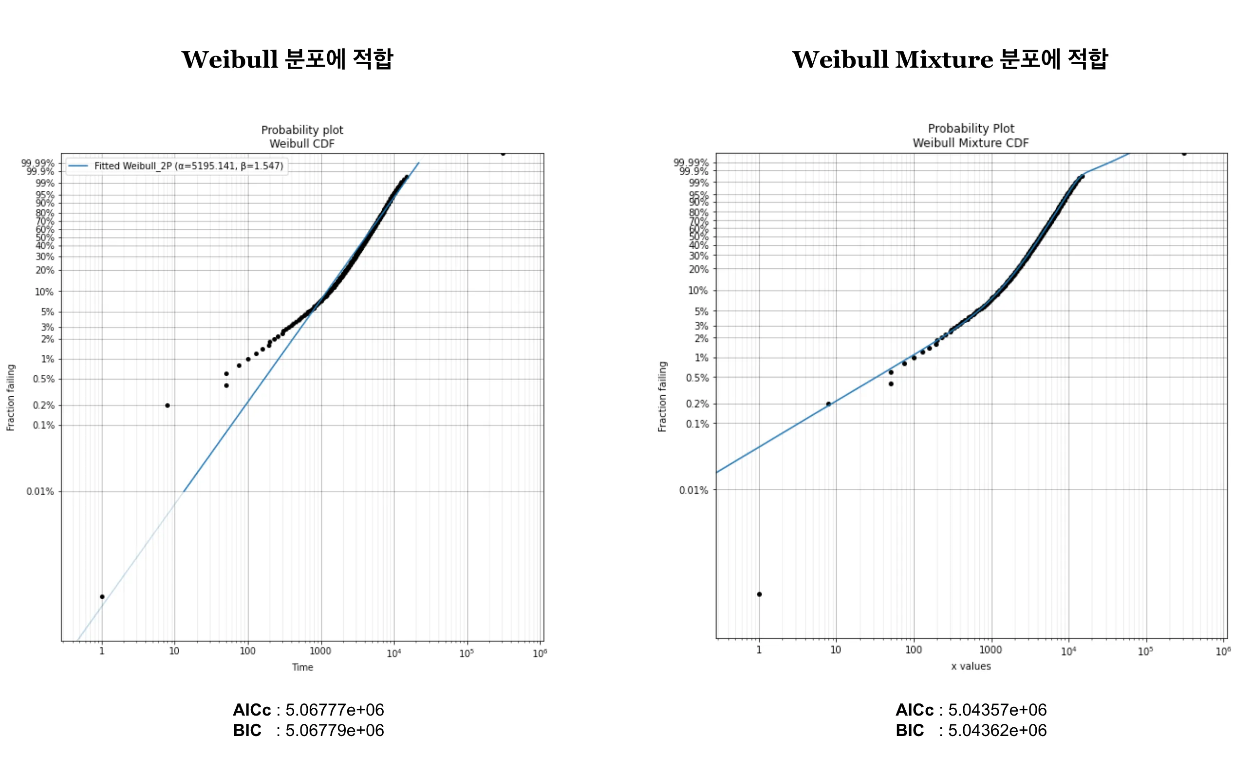 만약 어긋난 부분까지 고려하고 싶다면 Weibull과 다른 분포를 혼합(mixture)해볼 수 있습니다. 초록 물감으로 연두색을 대강 표현할 수 있지만 노란 물감과 섞으면 더 완벽하게 표현할 수 있는 것과 같은 이치입니다. 오른쪽 그래프는 가 Weibull Mixture 분포(Weibull + Weibull)를 따른다고 가정했을 때로, 거의 모든 점을 포함하는 이상적인 결과처럼 보입니다.