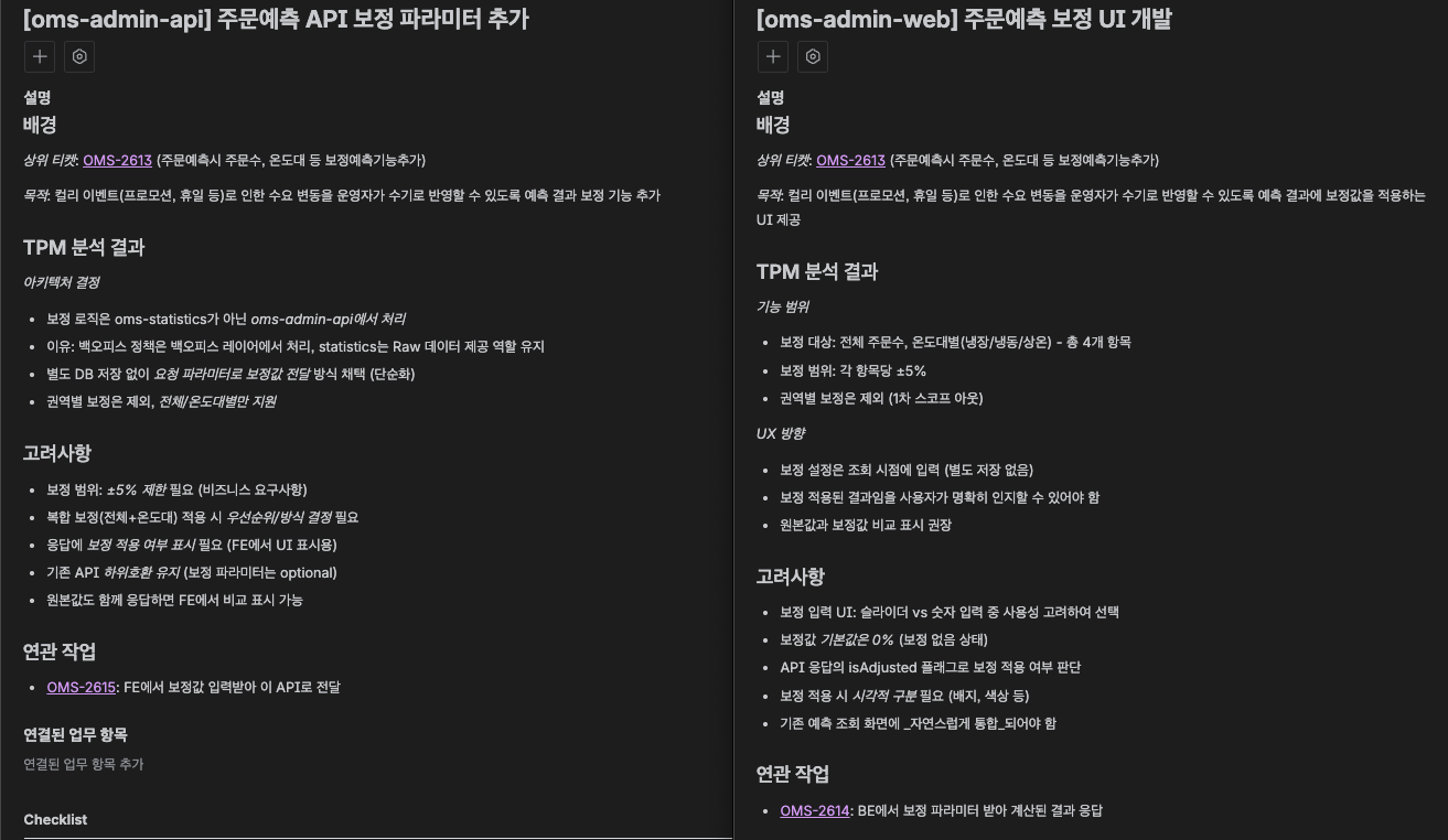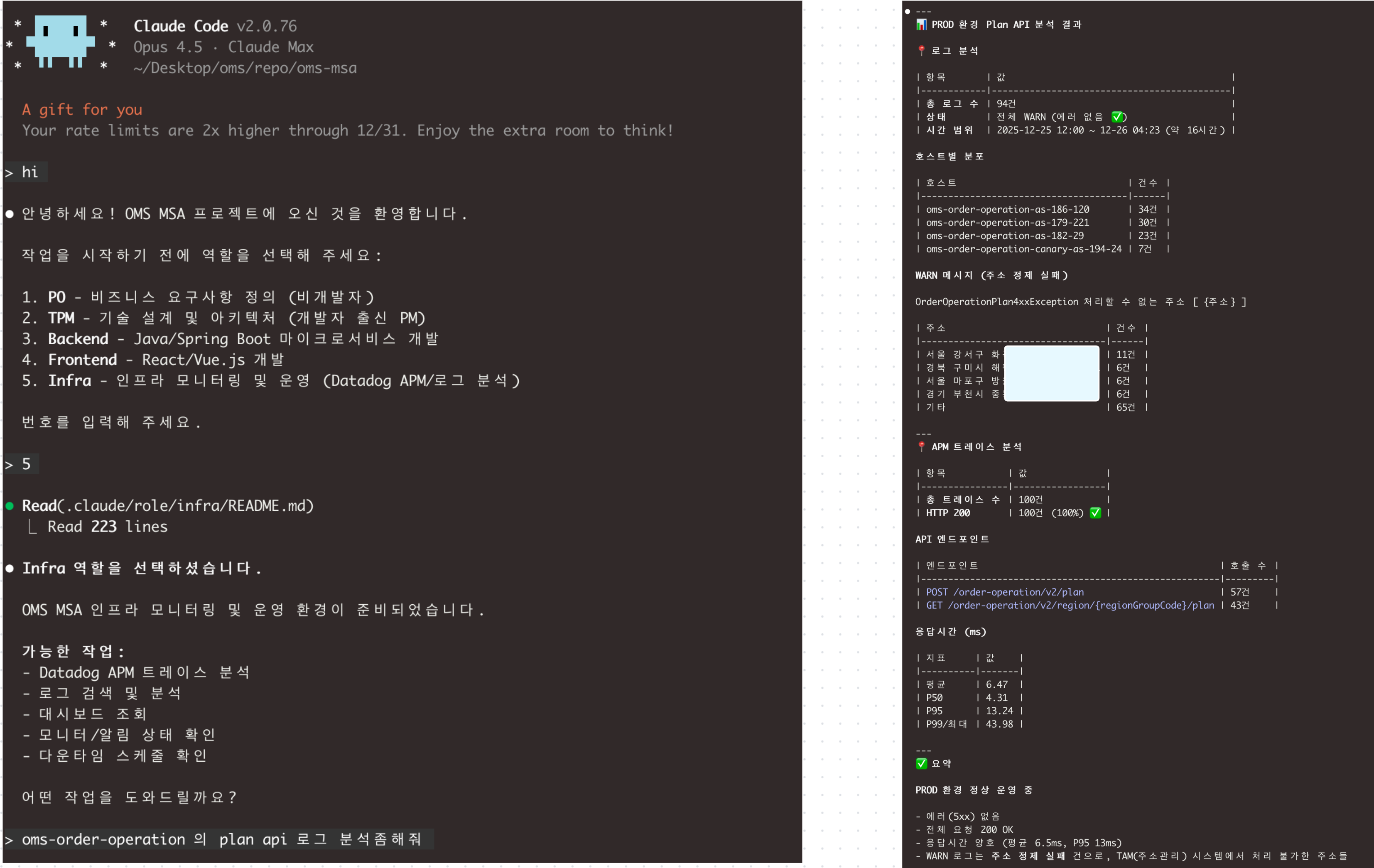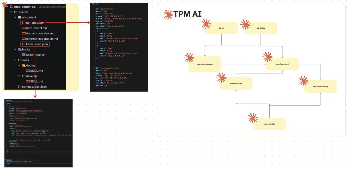 이제 모든 엔지니어는 OMS MSA의 중심에 Claude TPM 모드를 두고 각자 독립적으로 요구사항을 파악하고 계획을 수립할 수 있게 되었습니다. PM 입장에서는 개발 공수 산정을 위해 매번 OMS팀 전체를 소집할 필요가 없어졌고, 엔지니어들은 각자의 속도로 문제를 분석하고 설계할 수 있는 구조가 만들어졌습니다.