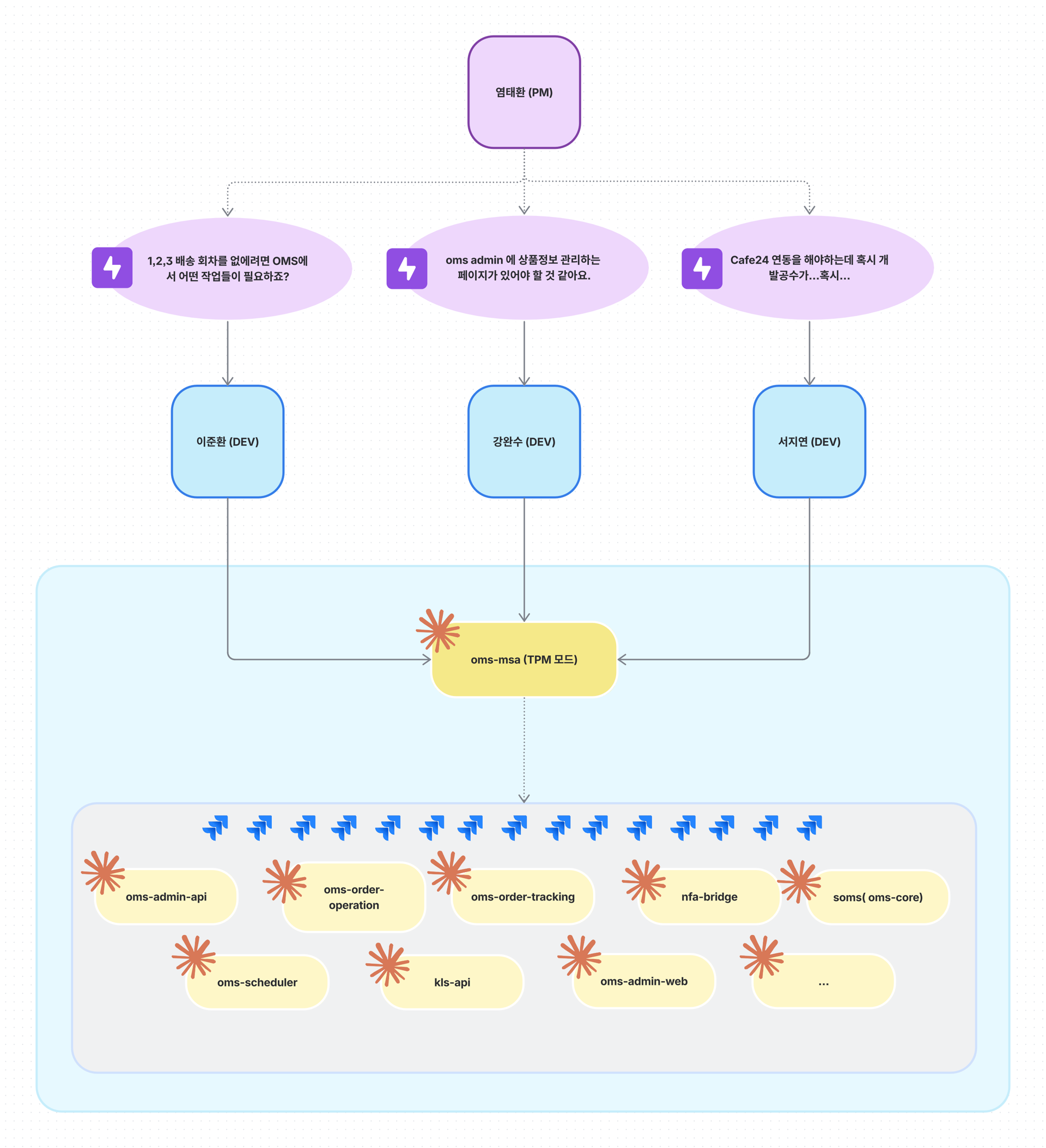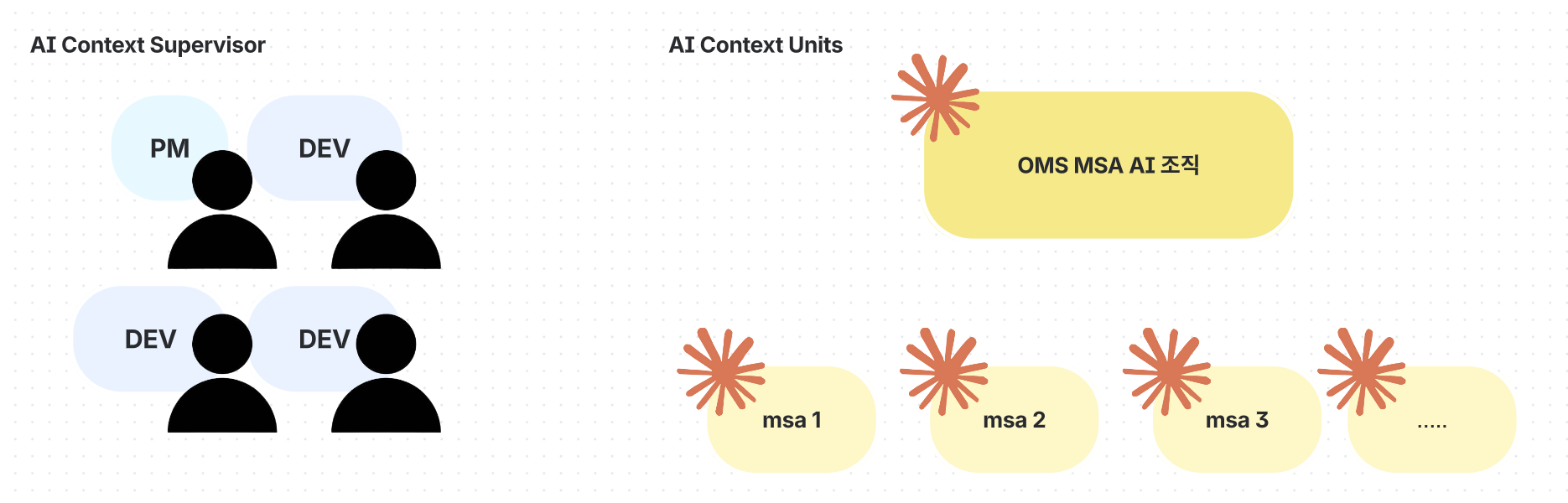 OMS팀에는 인간 PM 1명, 3명의 인간 AI Context Supervisor, 그리고 1개의 TPM AI + 11개의 MSA AI = 총 16명의 구성원이 일하는 대형 조직