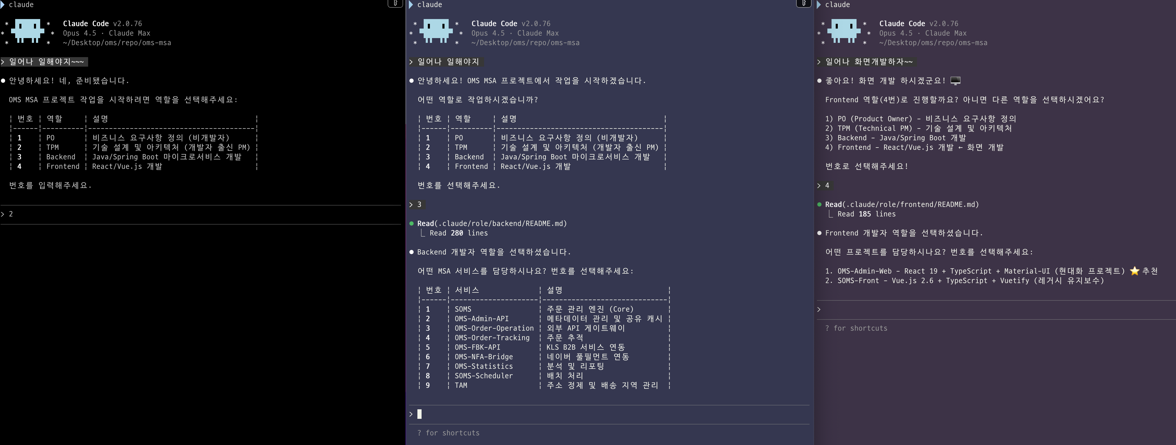 claude명령어로 Claude 세션 시작- 역할 선택 (PO, TPM, Backend, Frontend, Infra)